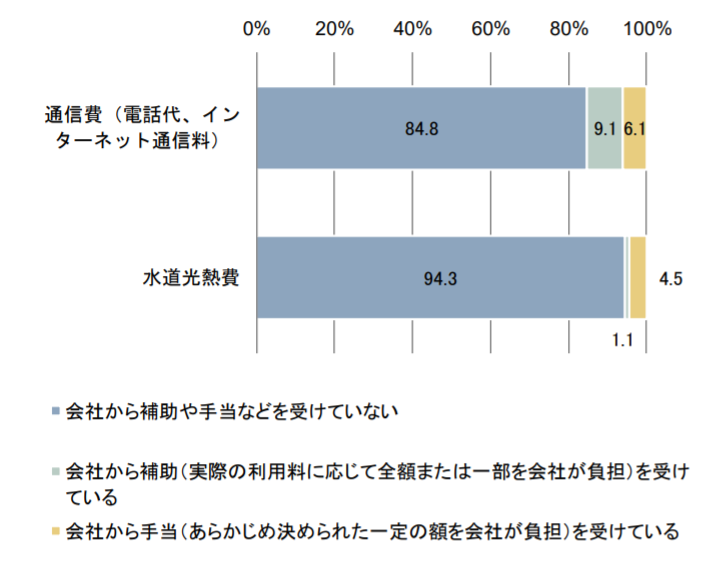 厚生労働省「これからのテレワークでの働き方に関する検討会」(第4回)で提出された「テレワークの労務管理等に関する実態調査(速報版)」によると、在宅勤務のための会社の補助や手当は以下のように、支給は進んでいないようです。